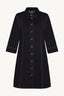 Denim shirt dress in a cotton blend with button-down front and 3/4 sleeves. Designed with contrast stitching and a feminine A-line silhouette.