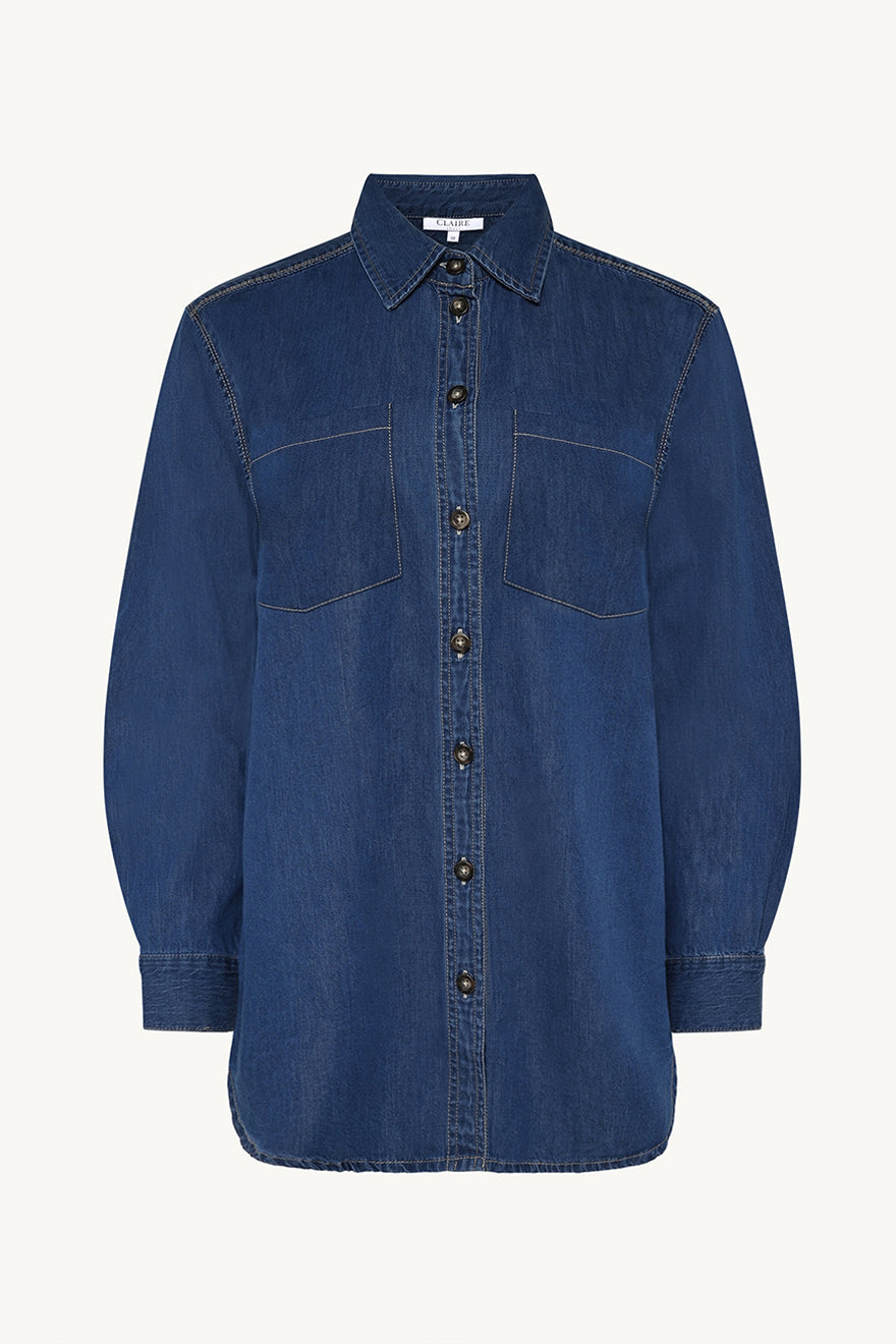 Denim shirt in 100% cotton with a relaxed fit. Designed with front button fastening, pointed collar and two chest pockets. The shirt has long sleeves with buttoned cuffs and a rounded hem, making it easy to style both open over a top or closed as a standalone piece. A timeless wardrobe classic in soft denim.