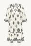 A stylish and airy dress made from a soft blend of 90% viscose and 10% polyamide. Designed in a regular fit, it features beautiful black embroidery on a light base, adding a bohemian and feminine charm. The dress has a flattering V-neckline, 3/4-length sleeves with elastic cuffs, and a tiered skirt for a relaxed yet elegant silhouette. Perfect for both casual days and summer occasions.