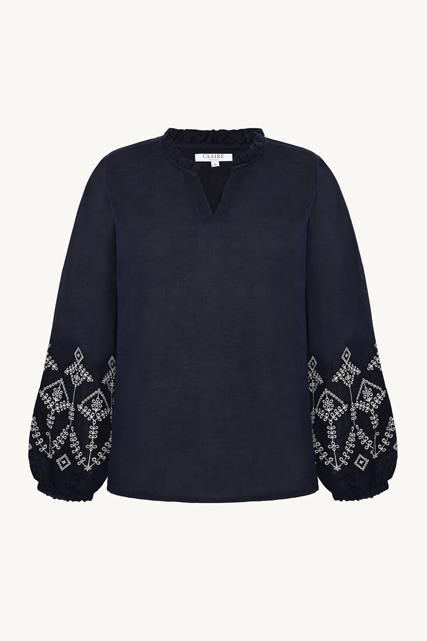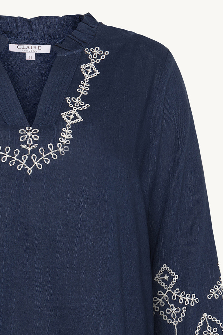 Blouse in a woven linen blend with V-neck and ruffle collar. The blouse has embroidered details on the chest and sleeves, as well as elasticated sleeves, slits in the sides and a longer back.