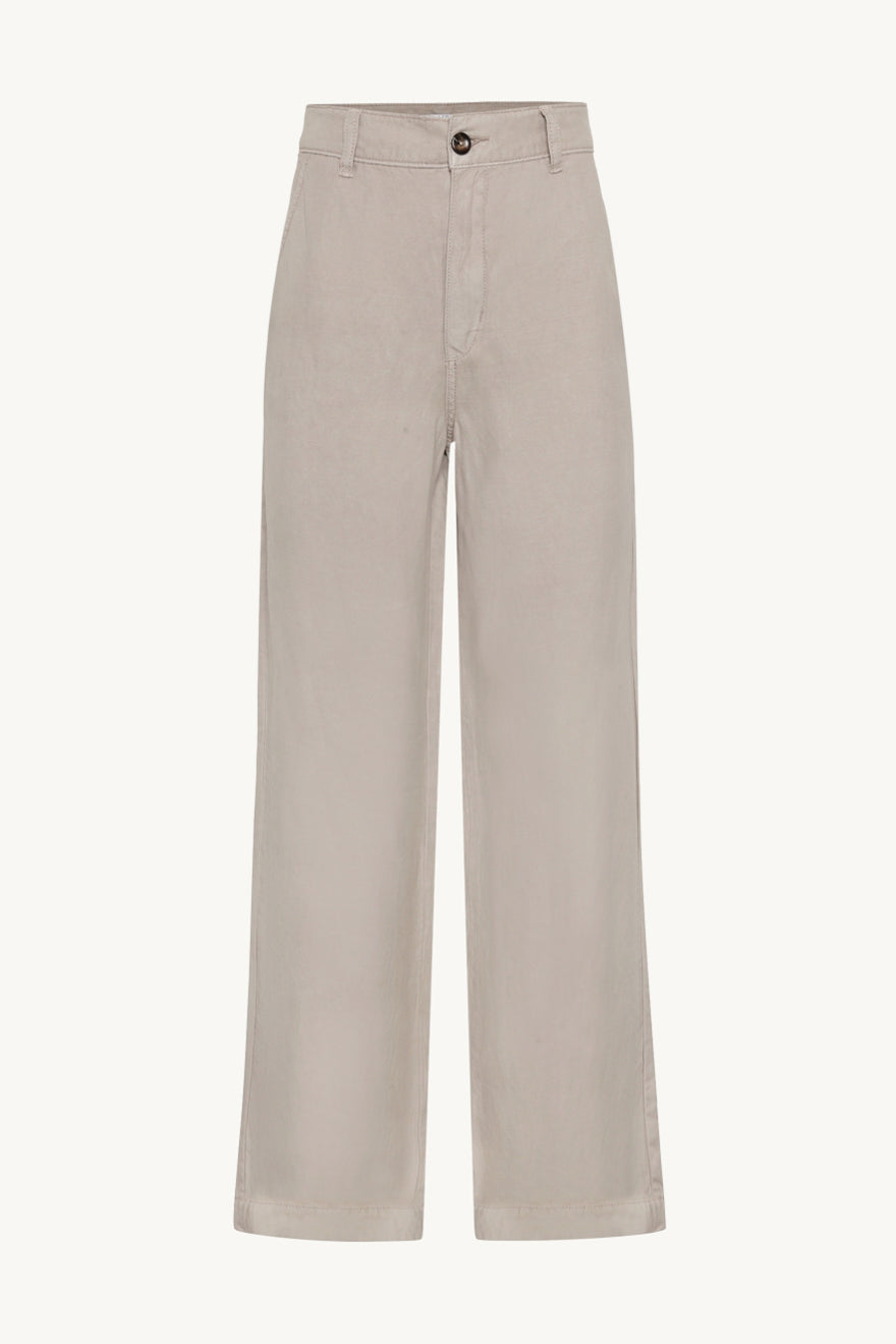 Wide-leg trousers in lyocell/leather with belt loops. The trousers feature front pockets and piped details at the back. These trousers come with a length of 80 cm in a size 38.