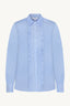 Striped shirt in woven cotton with a collar. The shirt has a concealed button fastening and ruffles down the front. The style features side slits and is longer at the back.