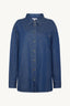 Loose-fitting denim shirt with a collar, a front button fastening and a chest pocket on the left side. The shirt has a rounded hemline and is longer at the back.
